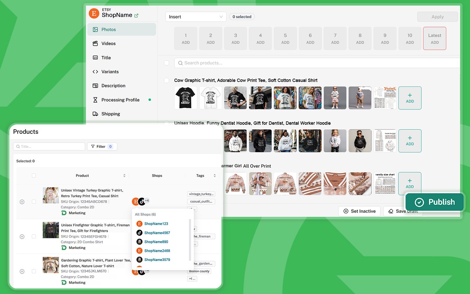 Upload once, publish everywhere. Our bulk listing tools let you publish hundreds of products across Etsy, Amazon, Shopify, and TikTok Shop with just a few clicks.